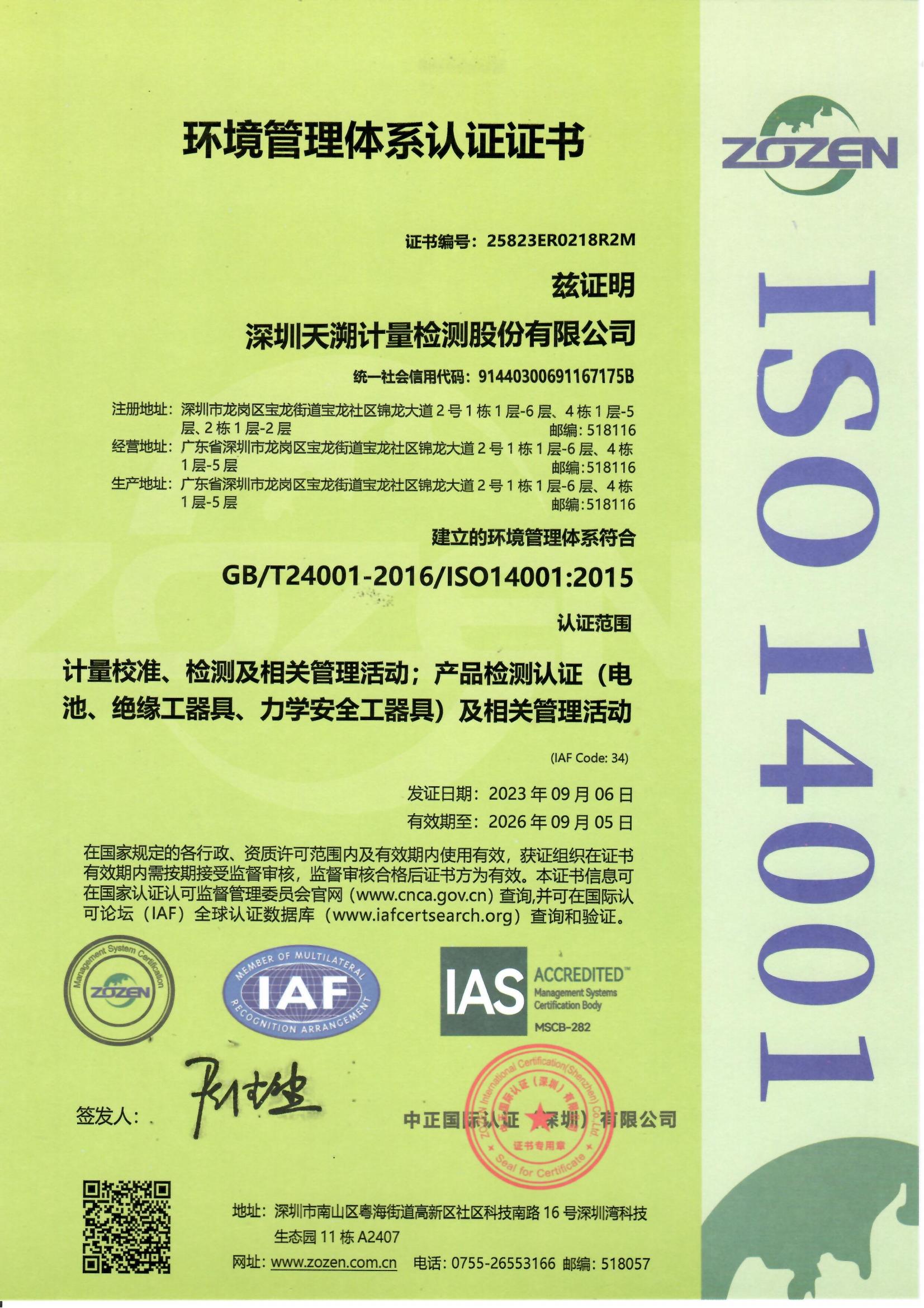 天溯計量ISO14001體系認證證書